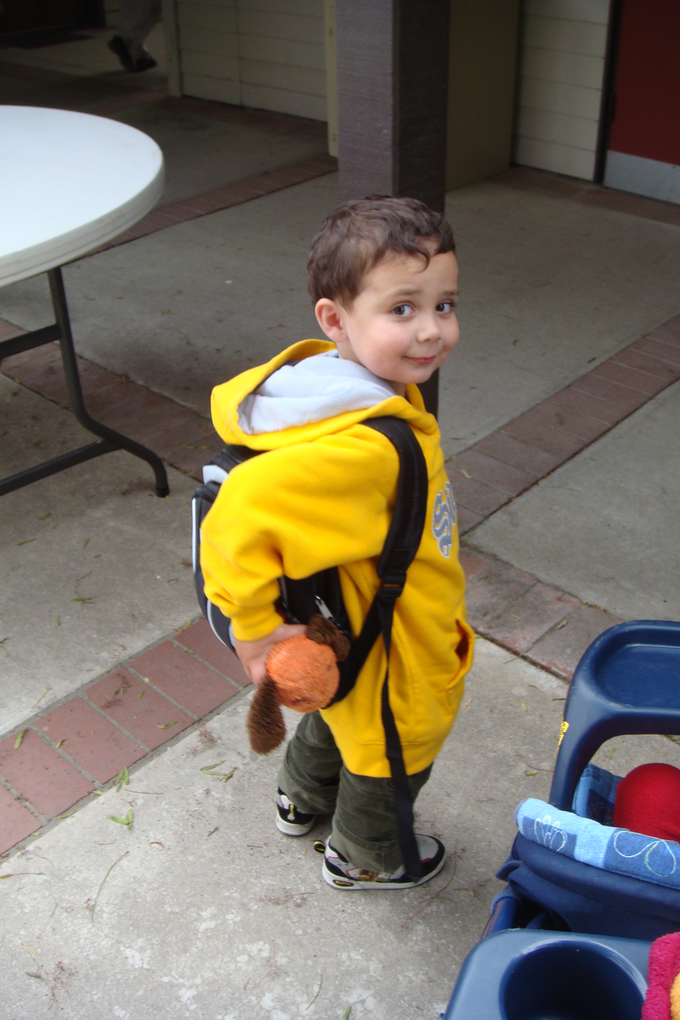 There’s no turning back now. Alex had his first full day of preschool last Thursday. He also wore his big boy undies. It’s a whole new world for him; the first taste of institutional education (albeit watered down for the ordinary Elmo-addicted three-year-old), and the often exhilarating and disquieting world of bladder control. I didn’t cry that first day, because, to be honest, I assumed I would be getting a phone call before I reached the minivan, to tell me that he needed to be picked up. I could almost hear the conversation in my head on the way back to the car. “We are terribly sorry, Mrs. Bloyer, but neither Alex nor our teaching staff is ready for this giant leap.” And yet, the call never came. I arrived back at the pick-up time and peeked through the tiny rectangular window in the door. To my amazement, he was sitting quietly on the rug listening to the teacher and wearing…..(drumroll, please) the same pants in which I had left him. Granted, the moment we got back to the car, he looked up at me sheepishly and said, “Mom, I think I hear the pee.” Which is code for, “Sorry, but it’s too late.” Who cares!!!! I was so proud of him for making it through the whole class, that I was still hugging him and giving him high-fives as we changed into a fresh, dry pair of Scooby-Doo size 4 drawers. It seems only now as I look up and see that little boy in the picture with Drooper (a dog I carried around when I was little) stuffed in his tiny backpack, that I am feeling a bit emotional. He looks so very fragile, which is really funny, for any of you who have actually seen the damage that this gentle tornado can inflict, but still….how to protect him, and still let him be the little funnel cloud that he is. What a scary prospect this is…the whole growing up thing.