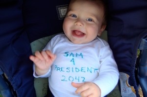 Sam began waving last weekend. Mostly towards himself, but also randomly and indiscriminately toward other things: a danish pancake, a bottle of ketchup, a hubcap. Occasionally, he will accidentally wave to a person, but for the most part we are greeting inanimates. Alex is also doing extremely well in preschool. His favorite project so far involved a pink construction paper pig which they “painted” with chocolate pudding. He was attempting to employ a very minimalist technique to the piece, so much of the medium had to be consumed. Zach is also loving school. I forgot to put his lunch in his backpack yesterday and so I got a glimpse of him at recess when I went back to sneak it in. It was incredible. It was like seeing an enormous box of puppies let loose. A bunch of little three foot people shrieking with delight, running around, often without destination or purpose, and tricycles whipping around the little sidewalk track at the speed of light. It was evidence that pure joy does in fact exists, but my attempt to find it in a latte or a doublestuff Oreo are woefully off target.
