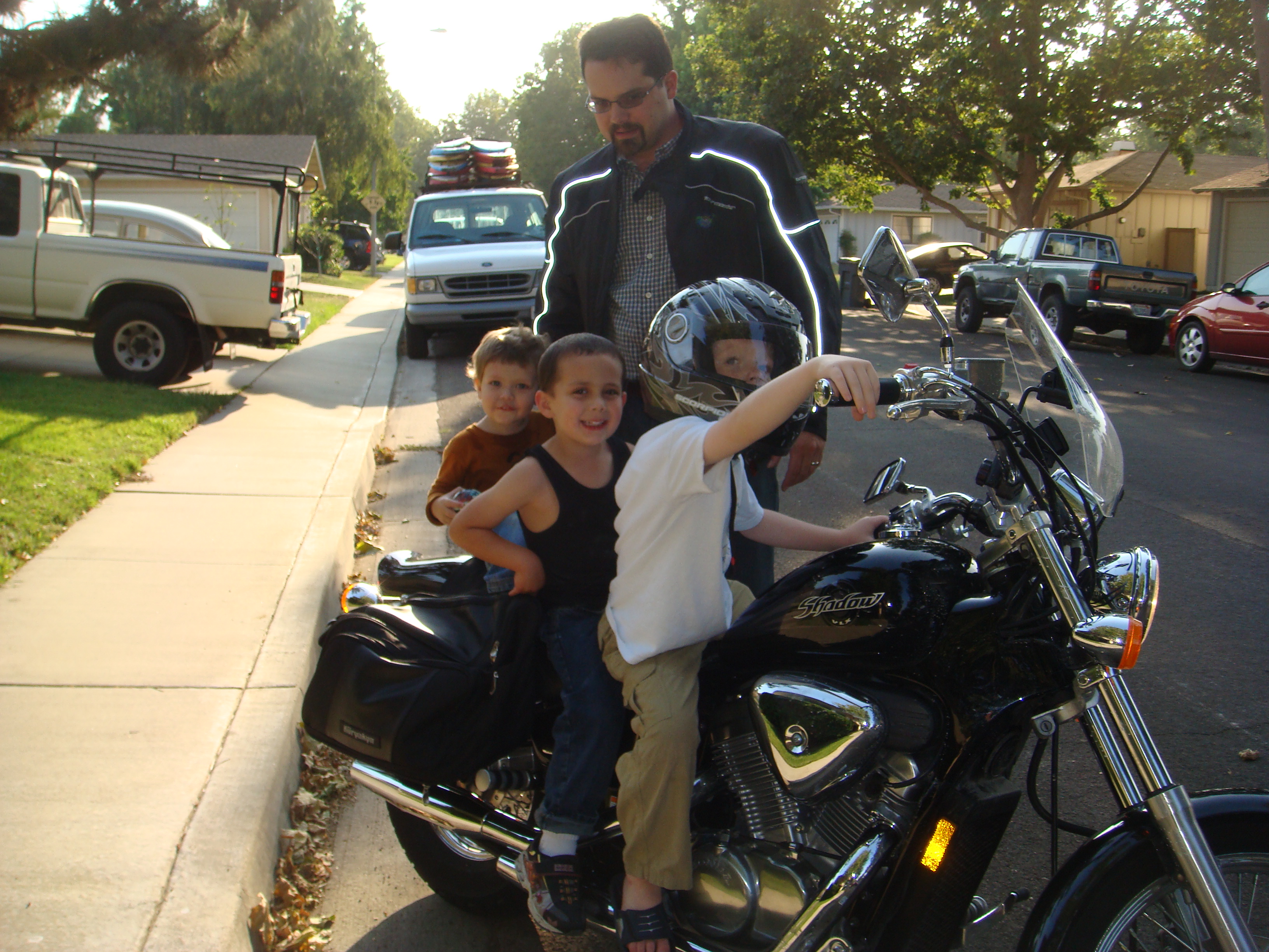 Margo…..hmmm….where to start. Chris has been eyeing her for several months as he has gone through the requisite training, license appropriation, and insurance shopping. She purred to him each time he would pass by her foster home on Ocean St. as he drove to work in the sweet gas-guzzling warhorse that we still call Plum. (Yep, that is the Plum PARKED on the street behind Chris and Margo, banished from the garage forthwith upon the new girl’s arrival). Everyone, especially Chris’ Mom, is horrified that I have not stopped this affair from commencing. She has only been with us for four days and yet I am already starting to understand the benefits of polygamy. She makes him so very happy. This, in turn, makes me very happy. The end result is a happy house where there is virtually no need for an adult time-out. The second night, he took Margo for a sunset ride and the next morning, as I picked up the crumpled pile of ridden clothes from the bathroom floor (yeah, he still does that, it’s not like she is a miracle worker or anything), I had to kill two bugs that he had inadvertently kidnapped during his ride. I could almost hear the conversation between the two of them. “What the hell happened? There we were flying along without a care in the world and then, BAM, we are trapped in the folds of some day-trader’s leather jacket and now some crazy woman with wild hair and a pink-floyd t-shirt is coming at us with a swiffer duster.” Bottom line, I told Chris he needs to shake off a little better before coming into the house after he and Margo have been out for a cruise.