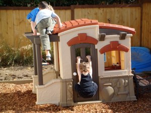 Well, we survived Thanksgiving….and my list of things to be thankful for is endless. Let’s see, hmmm, here are a few of them: I am thankful that we went to my Auntie Jan’s house, so that I didn’t have to desecrate any part of a sacred bird with my inept vegetarian hands. I am thankful that there were no serious injuries aside from perhaps a few overextended elastic waistbands. I am thankful that we were home, bathed, and jammified by ten after six. In fact, I was asleep before the Charlie Brown special ended, which is somehow both pathetic and wonderful. Chris spent today having wood chips delivered via dumptruck (a spectator sport to small boys) and then proceeded to haul them around back in order to get us much nearer to completing the Bloyer Playground. We will be dedicating a bench or special rock to all the brain cells that he and I have lost in our efforts to keep the kids physically engaged and occupied in the interior of our house for the last six years. Chris is under the impression that I will be able to simply kick them out in the backyard, lock the side gates, and have unlimited time to focus on my nails and bon bons. However, (as evidenced by the photos of my monkeys climbing ON all the structures, I think SOME supervision may still be required. Regardless, we are sooooo very proud of him for doing this for all of us. Everybody say, “Thanks, Dad”! At which point Sam (a man of few words) says, “Dee Doo”, with just the right, grateful inflection. Here’s to everyone keeping this holiday simple and peaceful. We should all remember to say, “Dee Doo”, to those who deserve it.